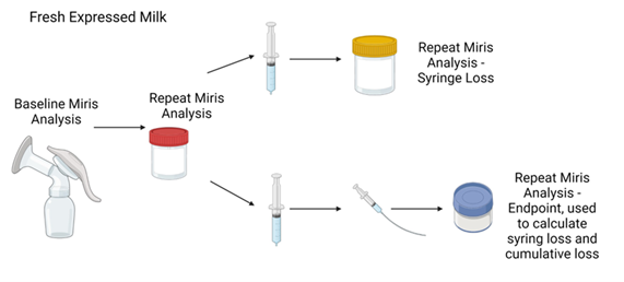 Figure 1 – Process to quantify macronutrient loss using 3 mL aliquots. The Miris HMA, will be used to obtain baseline values for lipids, proteins, carbohydrates, and total energy. Differences between stages of the milk transfer process will be quantified and used to determine the most important elements of the system to modify.